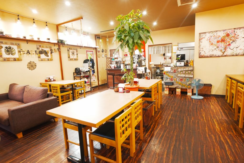 メインメニューである「上州牛手ごねハンバーグプレート」のほかにも、ピザ、パスタ、パンなどのメニューも提供。店内にはオーナーの趣味である観葉植物が癒しの空間を演出しています。