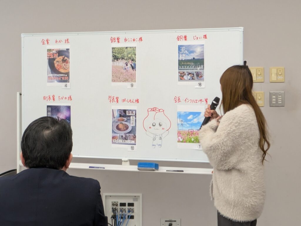 授賞式では関係者、受賞者以外に来賓者として玉村町長、群馬県立女子大学事務局長、玉村町魅力発信機構会長、インフルエンサーけーちゃんが来訪しました。